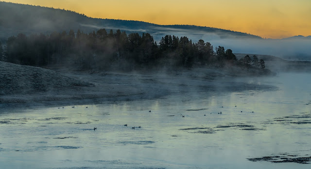 We bolted straight for Hayden Valley in a bid to see wildlife. As we arrived, mist and fog rose from the river and nearby thermal features, blanketing the valley in fits and starts, with the morning sun beginning to shine through it all.